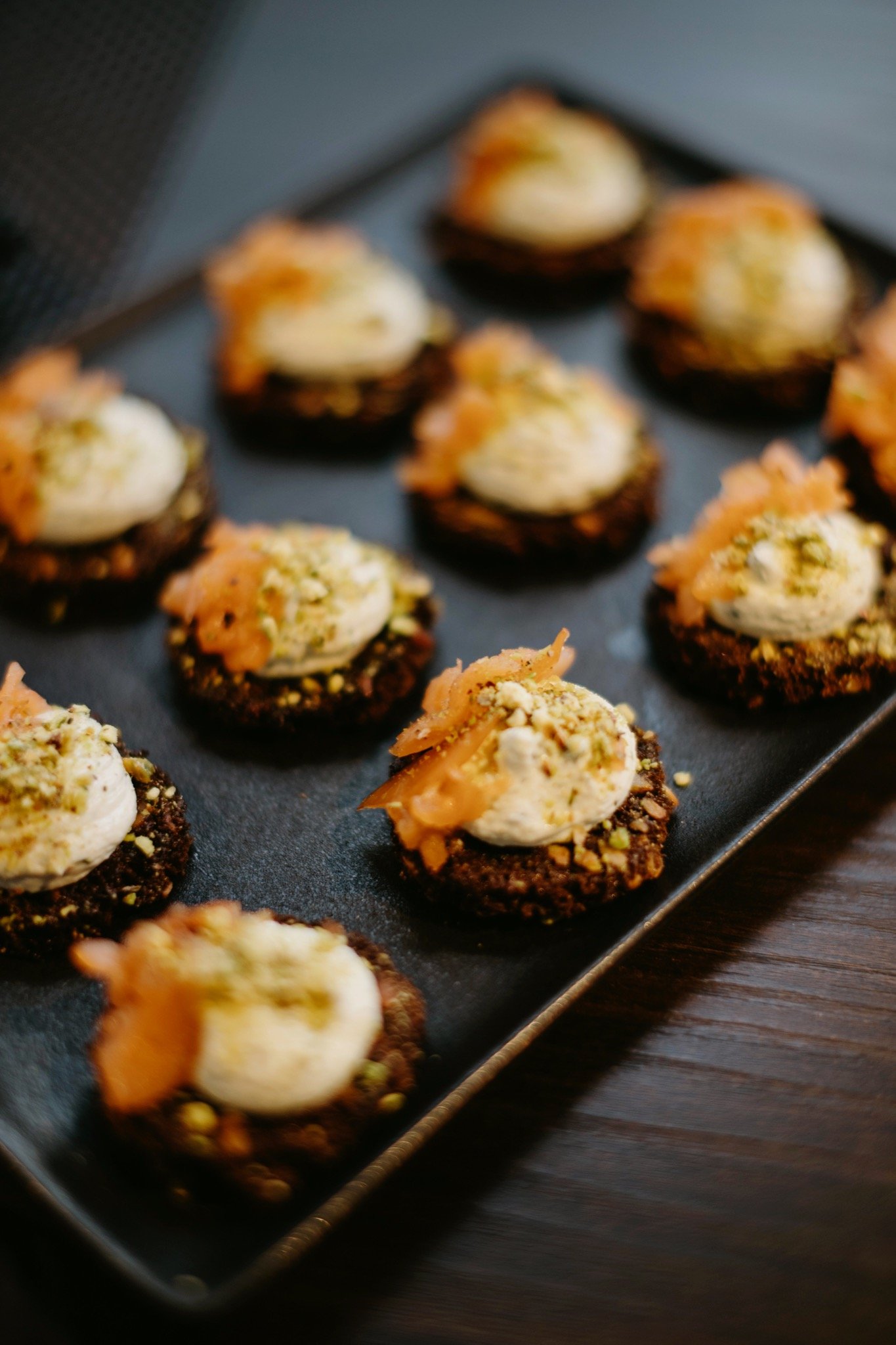 Užkandžiai: lašišos tartaras; burata su pomidorais; mini brioche su plėšyta kiauliena